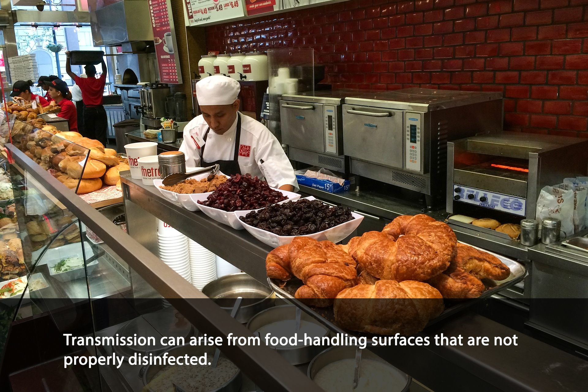 Norovirus transmission can also arise from food-handling surfaces that are not properly disinfected; if a food-handling surface is contaminated by a food product containing the virus, the virus can transfer to foods placed on the same surface. Outbreaks have occurred from contaminated food processing facilities, such as those producing deli meats. Likewise, if food is prepared by an infected person, the infected person may contaminate the food, especially when the person has improperly washed and sanitized his or her hands.