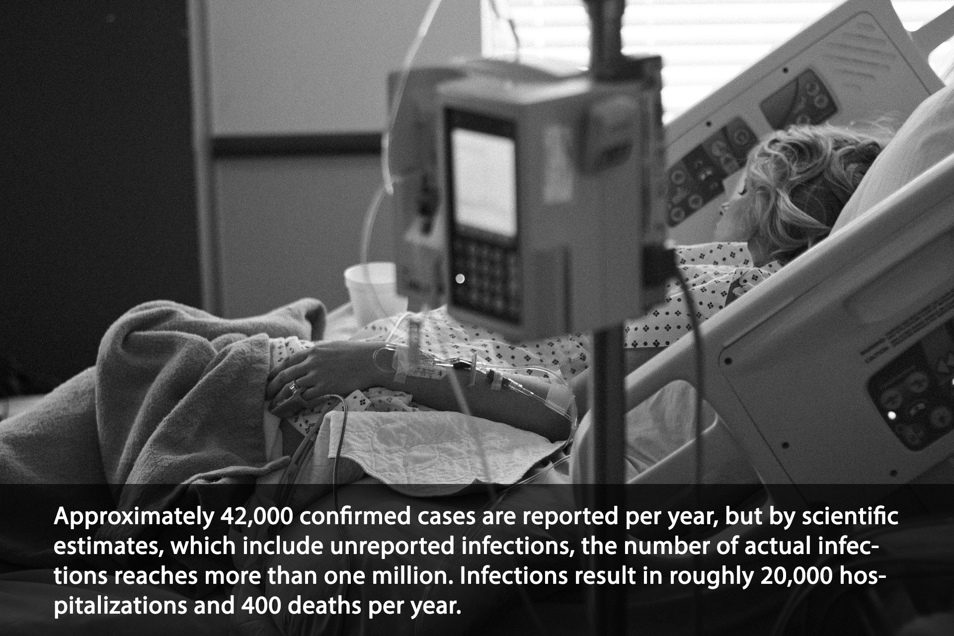 “Salmonella” is the second most common domestic foodborne illness.  Approximately 42,000 confirmed cases are reported per year, but by scientific estimates, which include unreported infections, the number of actual infections reaches more than one million. Infections result in roughly 20,000 hospitalizations and 400 deaths per year.  Symptoms of Salmonella food poisoning infection include diarrhea, fever and cramps arising within twelve to twenty-four hours after infection and, in most healthy individuals, persist for five to seven days. Infection is more common in summer months than in other seasons of the year.