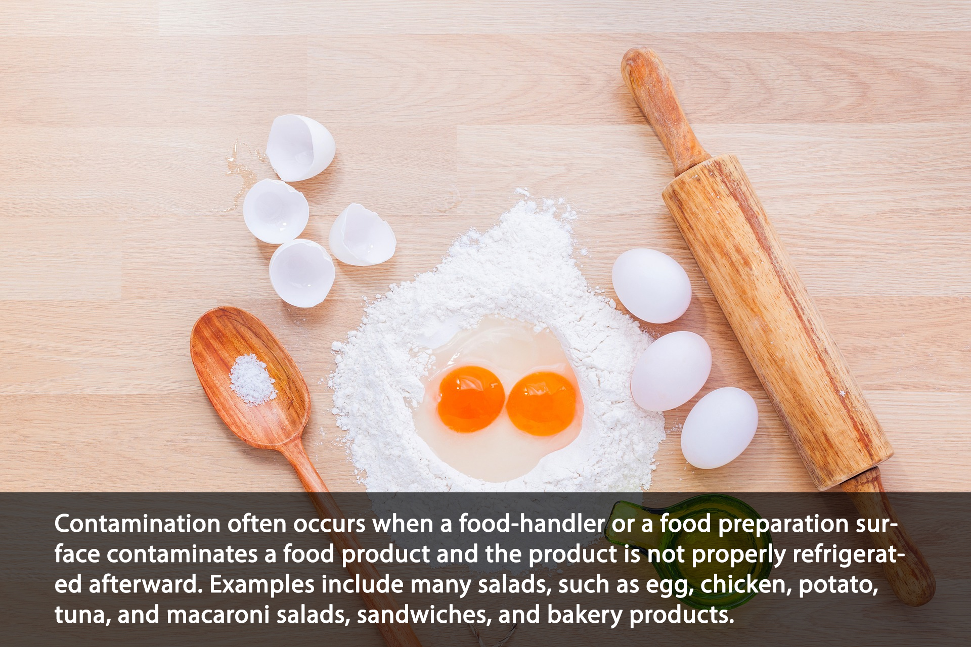 Staphylococcus is present everywhere you look. It can be found in air, dust, sewage, contaminated water, milk, foods, food equipment, humans and animals. The bacteria can be passed from person to person. Contamination often occurs when a food-handler or a food preparation surface contaminates a food product and the product is not properly refrigerated afterward. Examples include many salads, such as egg, chicken, potato, tuna, and macaroni salads, sandwiches, and bakery products. Bacterial growth also commonly occurs in foods that initially require a lot of handling and preparation and are kept at somewhat high temperatures after preparation, such as those kept under heating lamps on a buffet. Other common food sources include dairy products, various meats and egg products.